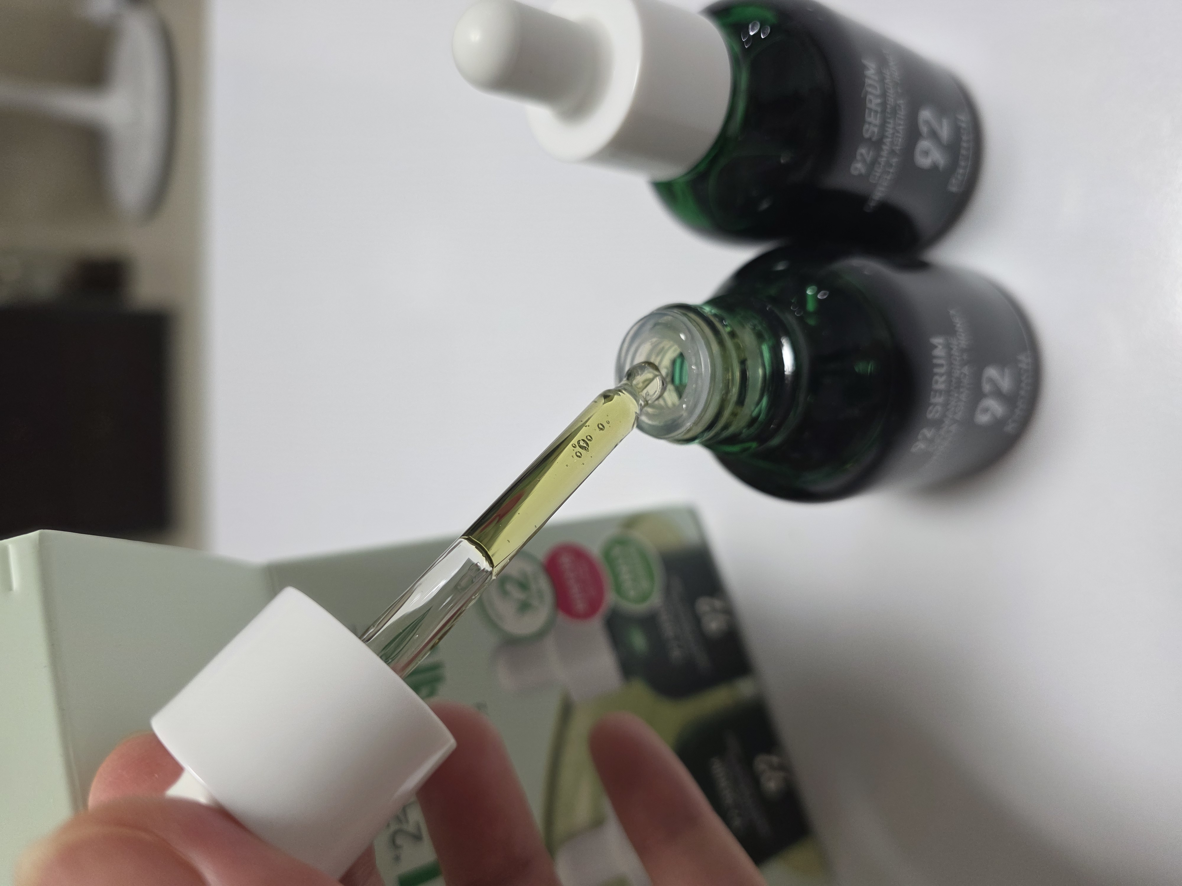 세럼 제형은 꾸덕과 묽음의 중간, 살짝 꾸덕한 편이에요. 남편은 바를 때 쑥 향이 난다고 했는데, 저는 오히려 자연스러운 허브향처럼 느껴졌습니다.